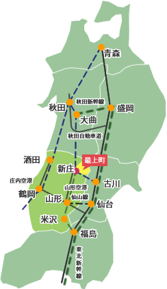 最上町は、山形県の右上、秋田県と宮城県に接する人口約10.000 人の町です。北と南に1000mを越える山々が連なる奥羽山脈に囲まれた盆地に位置し、分水嶺があります。分水嶺のある集落としては全国で二番目に低い海抜338m となっています。