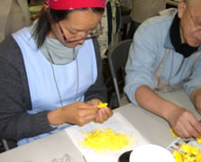 菊の花びらから萼(がく)を取りほぐす参加者たち |