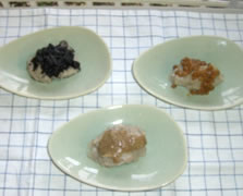 完成したかいもち(左上から時計回りに(1)ごまだれ、(2)納豆、(3)くるみだれ)