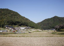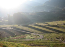 一夜明け、清々しい朝日がさしこむ棚田を民泊先の方と眺めました