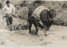昭和50年頃の様子「牛による農耕」この頃には、耕耘機なども入っていた所もありましたが、町内の一部ではまだ牛による耕作が行われていました。 |