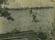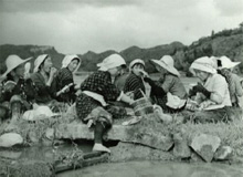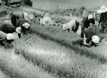 昭和40 年頃の田植えの写真です。手綱に沿って植えています。作業が遅いと手綱の位置をずらしたときに顔に泥が跳ねるので急いで遅れないようにやったものでした。後ろには、次に植える苗が束になって投げこんであります。 |