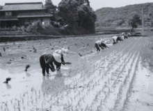 これは、田植えの昼食のときの写真です。泥だらけなので、家に戻らず田圃の畦で昼食を取っています。 |