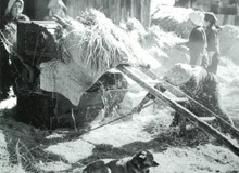 家で脱穀している写真です。このころの脱穀機は能率が悪く大変でした。 |