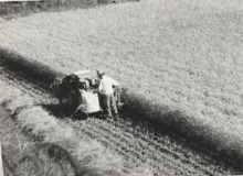 歩行型のコンバインで稲刈りをしているところです。これは昭和46年の写真ですが、一般的には昭和50年位から普及し始めましたが、鬼木は普及率が低かったと思います。 |