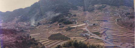 昭和60 年の鬼木の写真です。この頃は上の方の棚田まで耕作していましたが、段々耕作放棄地が増えていきました。 |